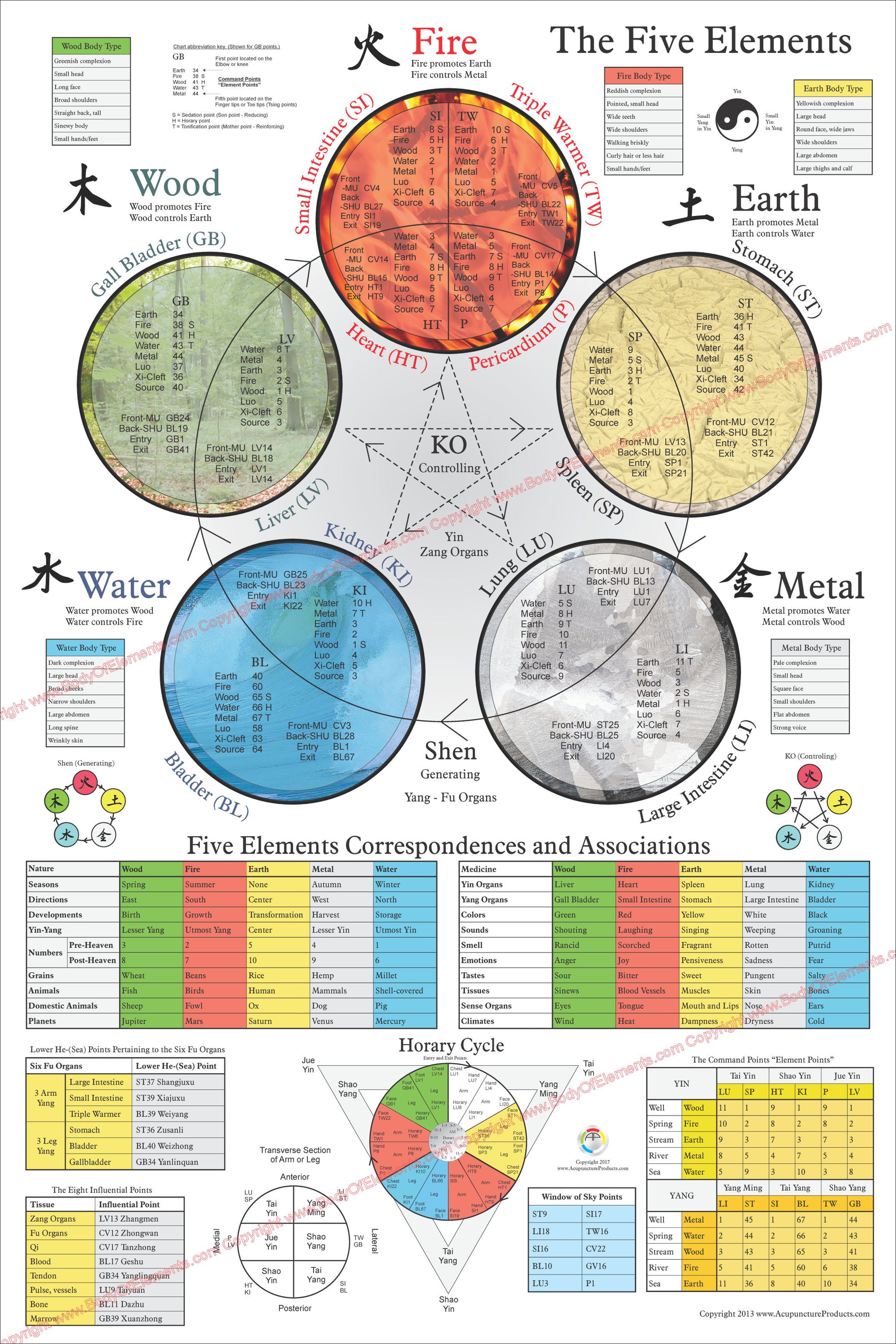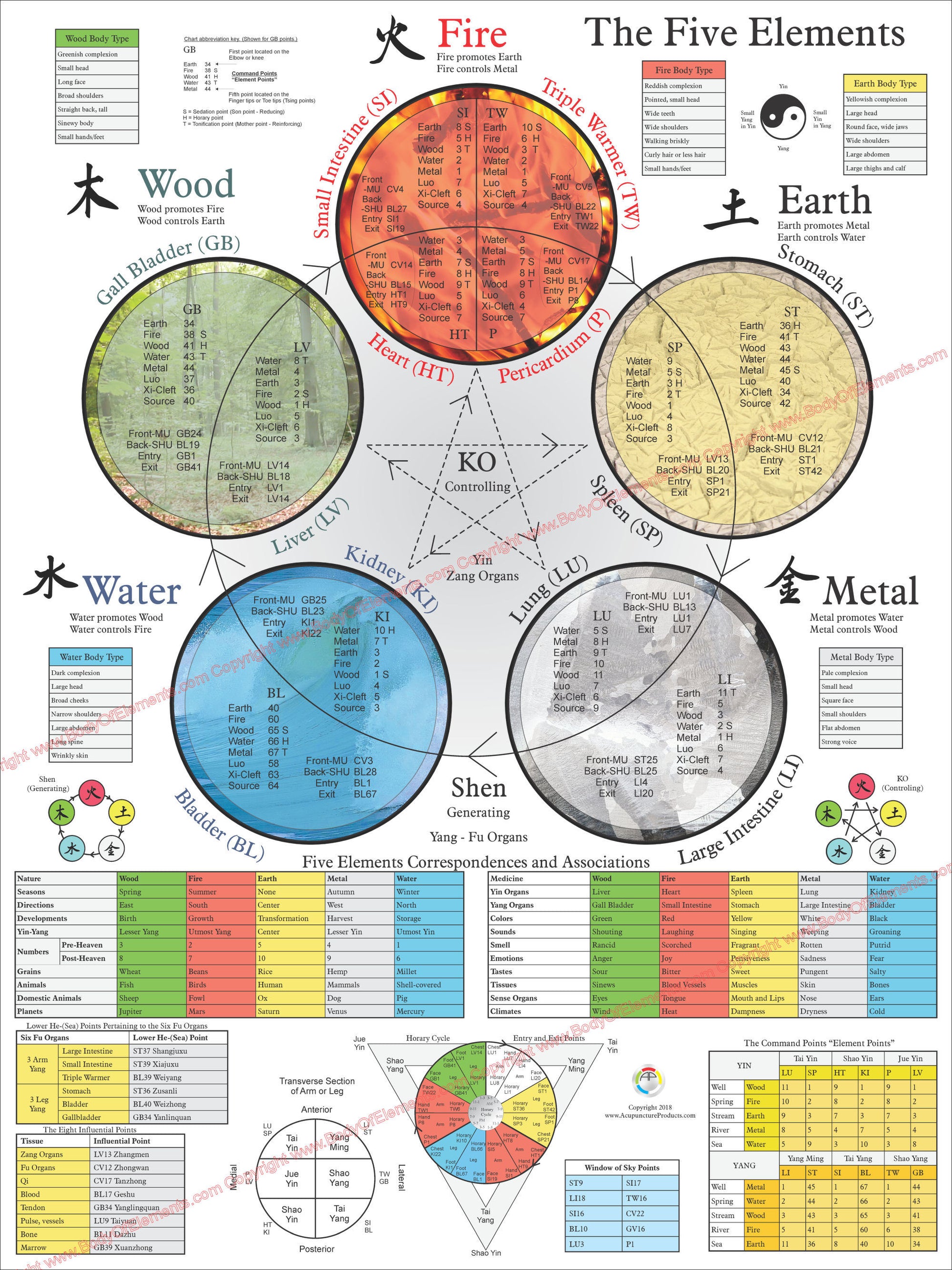 The Five Elements of Acupuncture Poster. The five element theory is the cornerstone of acupuncture and meridian therapy. The poster clearly shows the relationship of the 5 elements (Fire, Earth, Metal, Water and Wood). What a great quick reference for use with acupuncture treatment. The colorful graphics help explain traditional Chinese medicine concepts to patients.