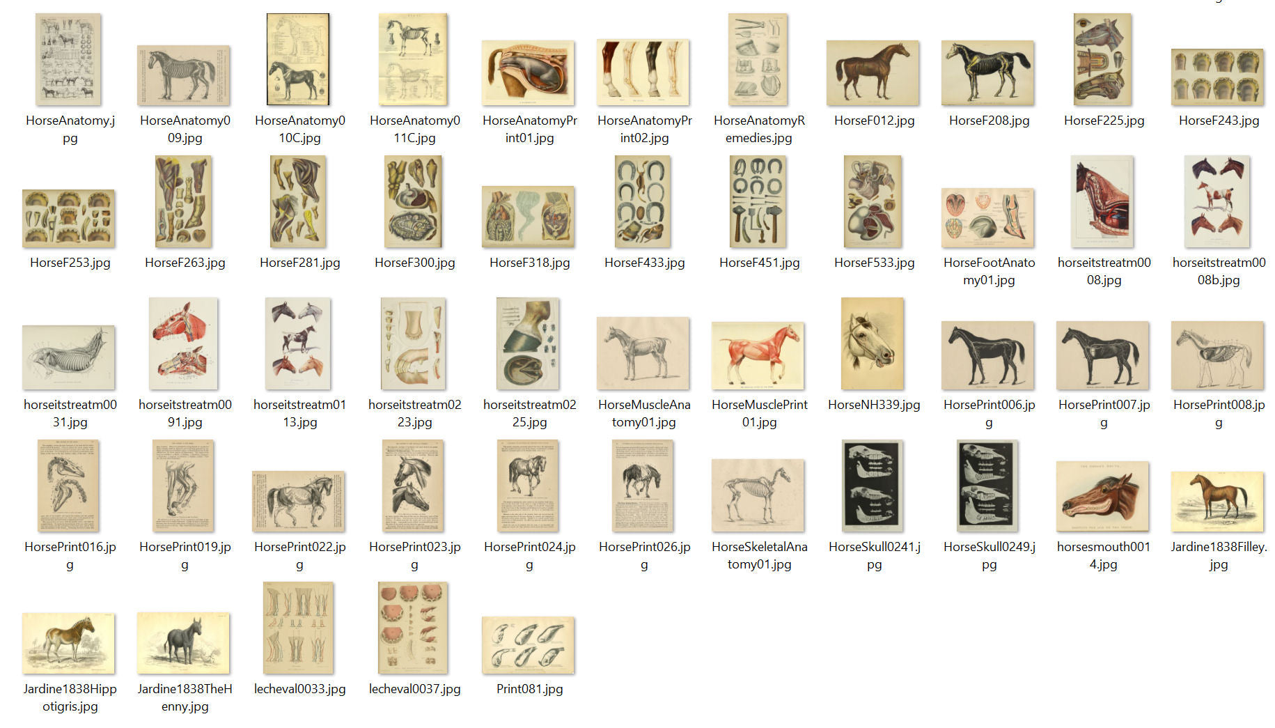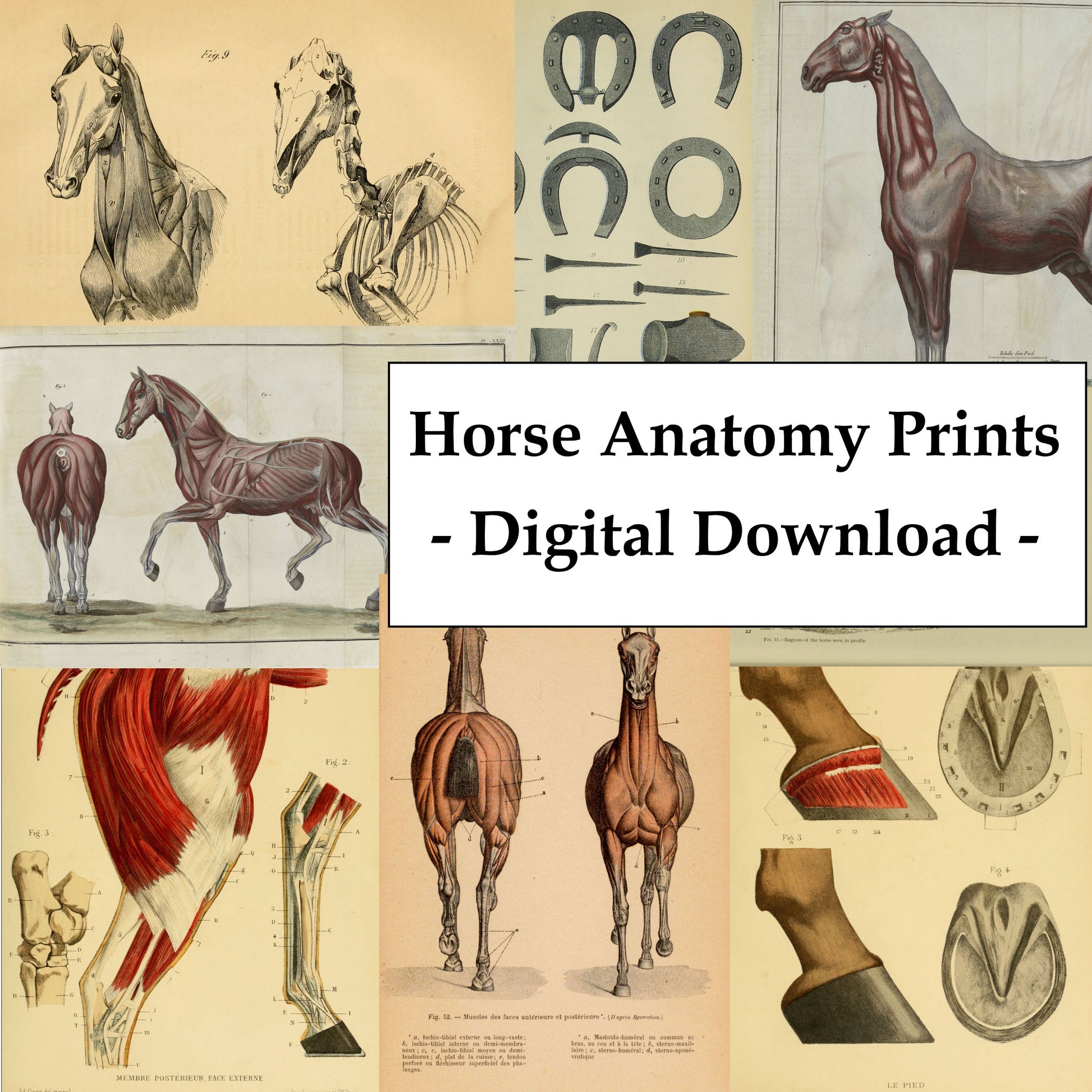 115 digital prints of horse anatomy illustrations from the 1800's and early 1900's. Each .jpg image measures 1000px to 2500px on the long side. Clipart for collage, junk journals...