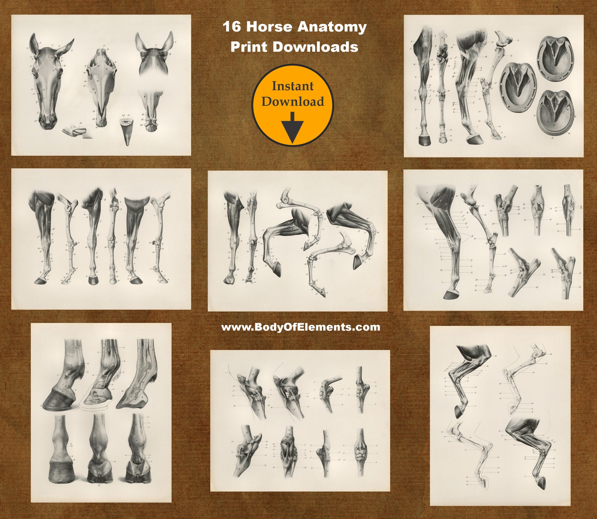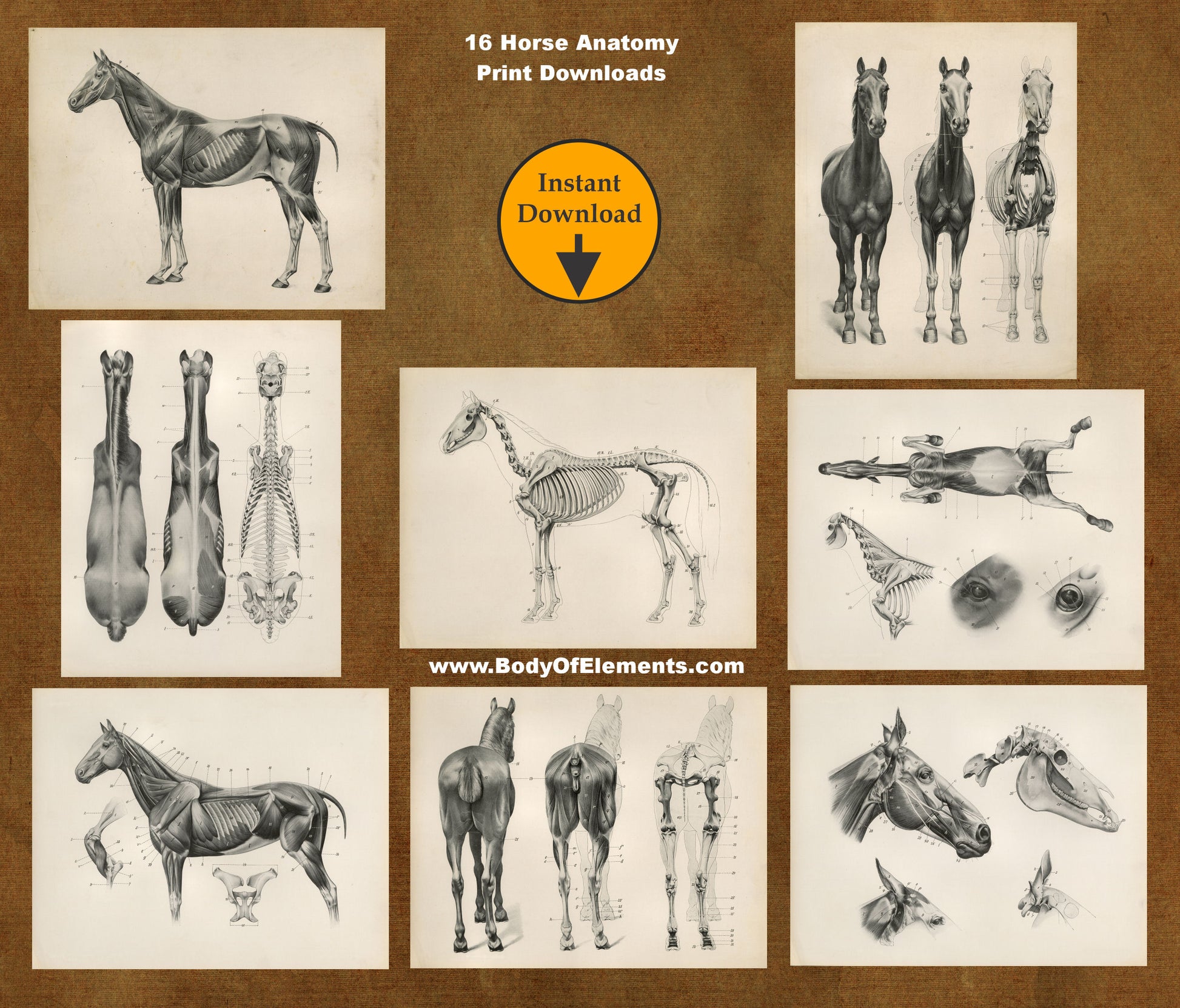 16 vintage Horse anatomy print files covering the exterior anatomy, muscles and bones. Images in .jpg format measuring 3600px X 2800px. Clipart for collage, printable, junk journals...