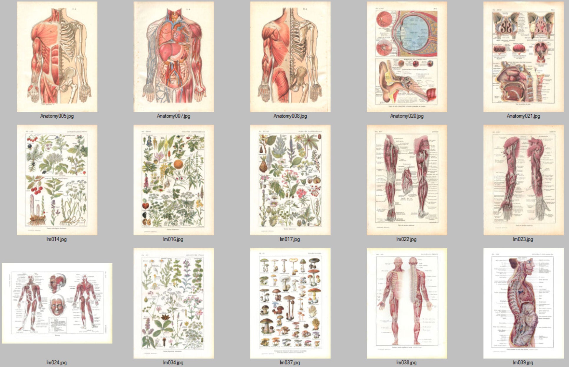 Digital Scans showing the human muscles. Anatomy of the eye and ear. Cross section of the nose and throat. Internal organs of the thoracic and abdominal cavities. Medicinal plants. Colorful digital download scanned in .jpg format. Size 2000px X 1500px. Clipart for collage, printable, junk journals...