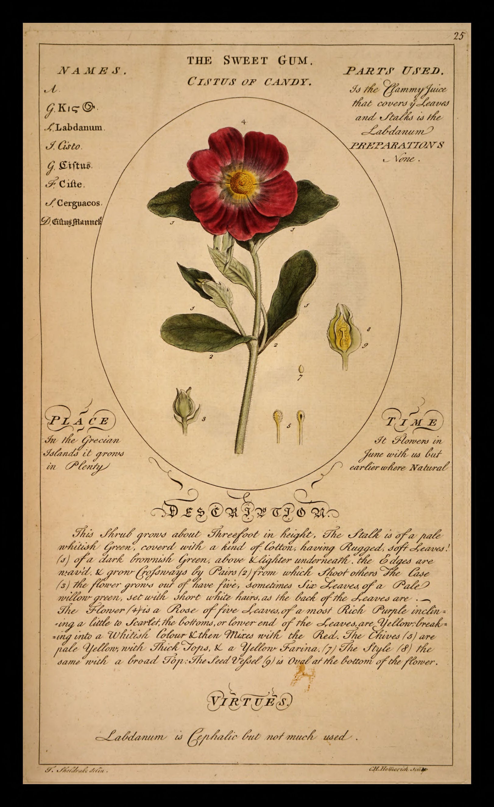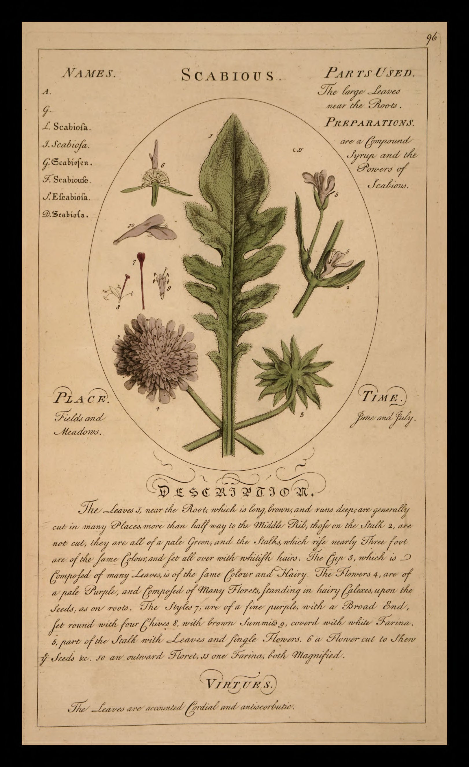 Vintage medicinal plant illustrations published in 1759. The plates describe their places of growth, names in 9 languages, parts used, preparations, time of flowering, descriptions and virtues. Botanical Art Herbal Apothecary.